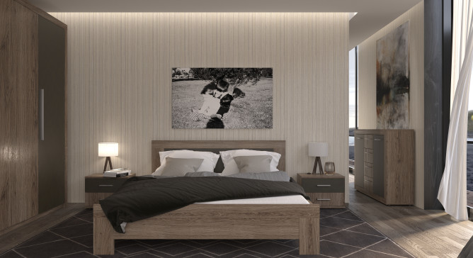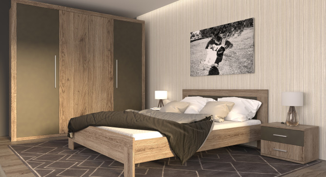 Модульна спальня Джульєтта ВМВ Холдінг виготовляється з високоякісної ламінованої і кашованої плити ДСП класу Е1 на обладнанні німецьких та італійський виробників. Виготовляється в кольорах: корпус - дуб арканзас темний, фасад - дуб арканзас темний/бронза. Модне поєднання дерев'яної структури з глянцевими вставками наповнить кімнату сучасним стилем. Спальня складається з найпотрібніших компонентів: це широкий функціональний комод, велике ліжко, широка вмістка шафа та приліжкові тумбочки. Завдяки мінімальній кількості компонентів у Вашій спальні не буде відчуття захаращення простору. Кімната буде свіжою, теплою та легкою. Пропонуємо також переглянути модульну спальню Ріко.